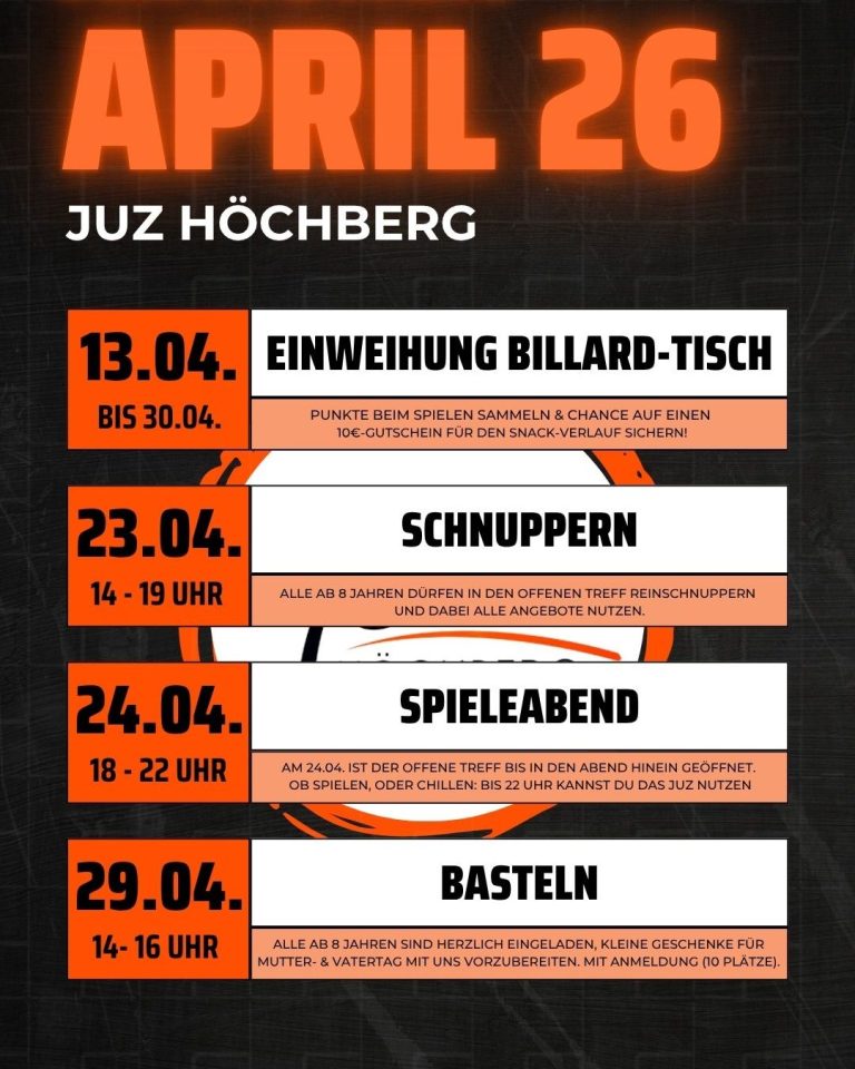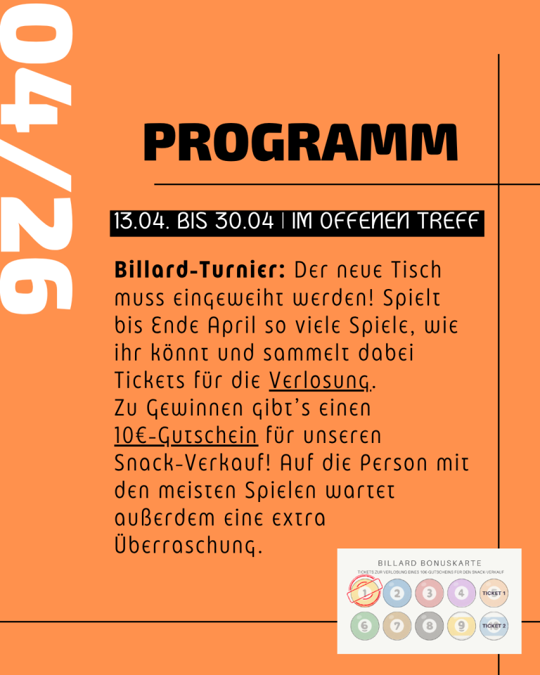 Der offene Treff bietet Raum für Austausch und Begegnung. Besucherinnen und Besucher können zwischen Gesellschaftsspielen, Tischtennis, PlayStation, Billard und verschiedenen Ballsportarten wählen. Oder auch einfach nur etwas im JUZ zur Ruhe kommen.